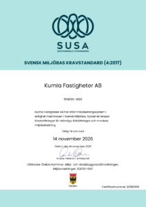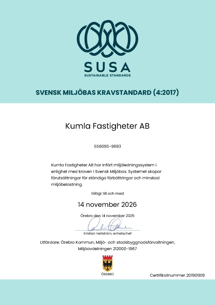 Vi är miljödiplomerade! Kumla Fastigheter är sedan april 2019 miljödiplomerade enligt kraven i Svensk Miljöbas Kravstandard (4:2017)